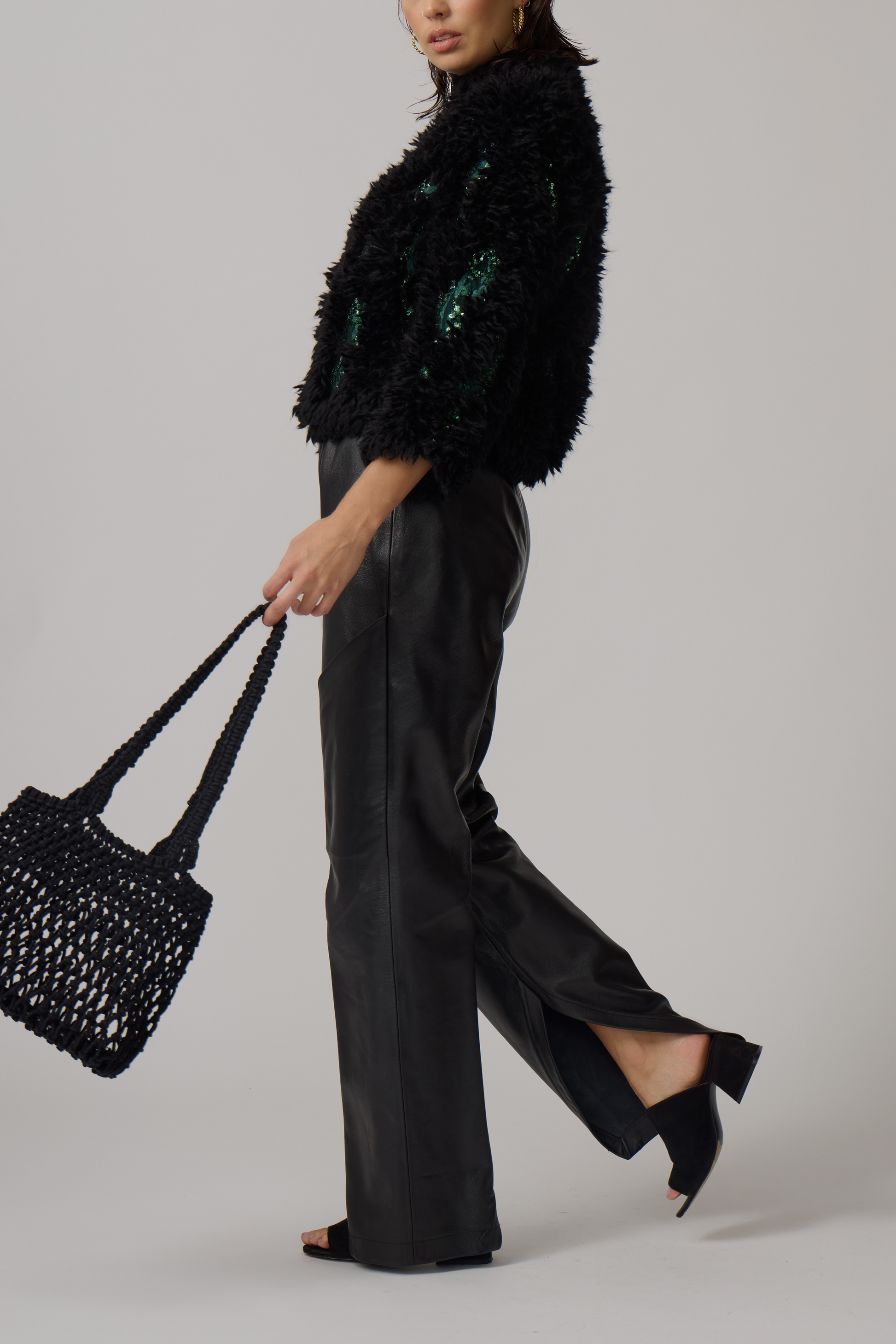 Hand knitted wool yarn jacket with beautiful embellishment details. This is special fur jacket with hidden hook and eye closure at top. Cropped at the waist for a fashionable fit.